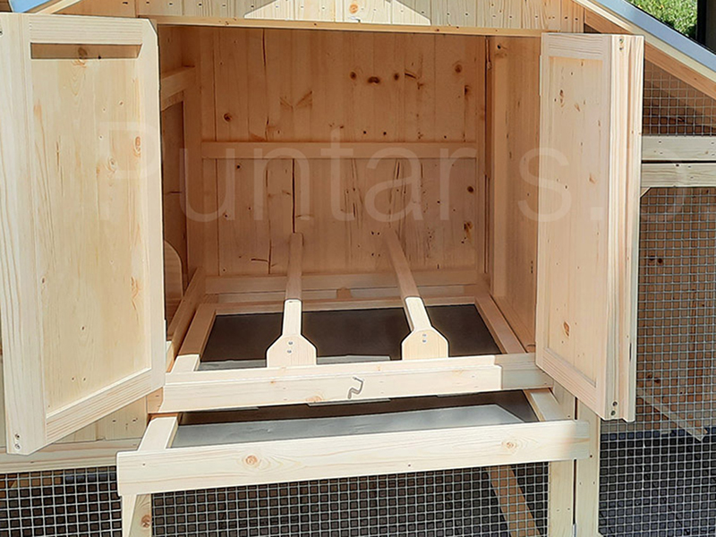 - Zadnja, leva in desna stran kokošnjaka so lesene in ščitijo pred vetrom.